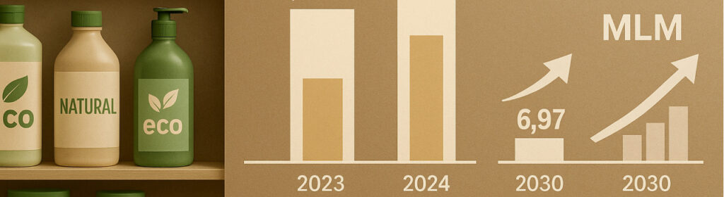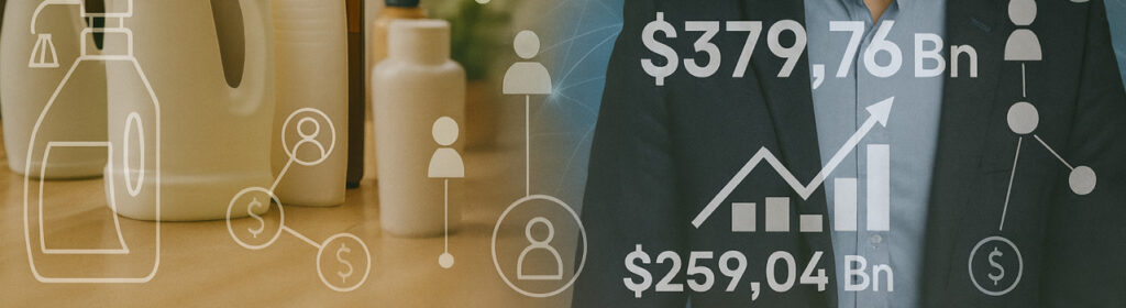 У 2023–2024 рр. світовий ринок побутової хімії оцінювався в $207–259 млрд з прогнозним CAGR 4,4–6,4 % до 2032 р., при цьому частка Asia Pacific становила 35,9 %, Європа — близько 23 %, Північна Америка — 15 % ринку. У сегменті натуральних засобів обсяг ринку досяг $6,97 млрд у 2024 р. з CAGR 11,3 % до 2030 р. Паралельно глобальний MLM-ринок досяг $190 млрд у 2024 р. і зросте до $294 млрд до 2033 р. при CAGR 5 %. У цьому контексті мережевий маркетинг побутової хімії поєднує високу частоту покупок (щомісячний попит 100% домогосподарств) і доступ до зростаючого MLM-ринку.